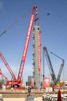 國(guó)內(nèi)起重量最大的履帶式起重吊裝機(jī)首次亮相天津?yàn)I海新區(qū)百萬(wàn)噸乙烯項(xiàng)目建設(shè)工地。這臺(tái)采用了一系列先進(jìn)技術(shù)的吊裝機(jī)最大起重量達(dá)1600噸,由中國(guó)石化集團(tuán)第四建設(shè)公司投資1.4億元全套從德國(guó)引進(jìn)!爸腥A第一吊”的調(diào)試安裝到位,填補(bǔ)了國(guó)內(nèi)巨型吊裝設(shè)備的又一空白,有效解決了國(guó)家重大能源、原材料建設(shè)工程中特大型設(shè)備的安裝難題。圖為重達(dá)千噸的工化塔被徐徐啟動(dòng)。 |