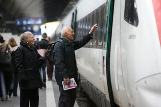 盡管在瑞士蘇黎世州每千人擁有私人汽車超過800輛,但是仍然有60%的居民在高峰時段選擇公共交通工具出行。由49家公交運營公司組成的蘇黎世公共交通網絡提供鐵路、公共汽車、有軌電車、無軌電車、湖船等服務,其中軌道交通通車里程約為600公里。乘客一票在手可以在所購車票規(guī)定時間內不限次數(shù)乘坐任意公共交通工具。圖為在蘇黎世的中央車站,兩位老人與親友道別。