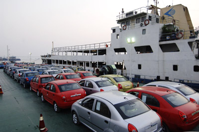 一批出口到委內(nèi)瑞拉的奇瑞汽車(chē)在碼頭等候裝船(10月16日攝)。本報(bào)記者:李健