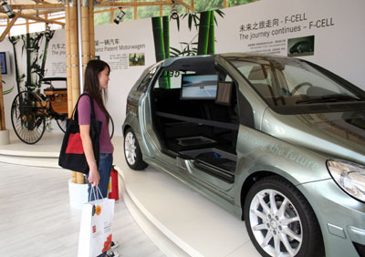 圖為德國戴姆勒公司的展館帶參觀者回顧了汽車的發(fā)展史,也展望了汽車發(fā)展的未來。展館內(nèi)展出了世界上第一輛汽車的模型,它的旁邊就是一款能夠“零排放行駛”的梅賽德斯-奔馳B級燃料電池車。杜鵑