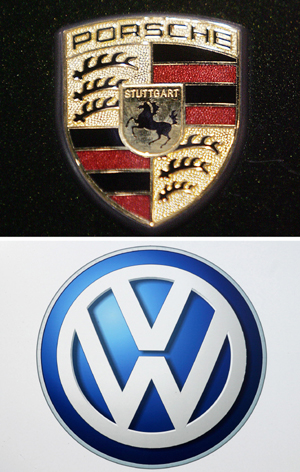 這張拼版照片顯示的是保時捷(上)與大眾(下)汽車的標(biāo)識。