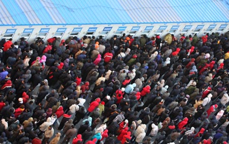 1月12日是2009年春運(yùn)的第2天,鐵路北京西站迎來(lái)購(gòu)票高峰,廣場(chǎng)上的售票區(qū)人山人海。