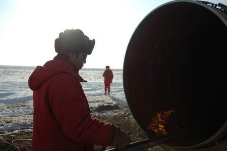 中國農歷牛年大年初一,中國石油天然氣管道局中亞管道項目部職工在哈薩克斯坦江布爾州施工現(xiàn)場為即將焊接的管道加熱。中亞天然氣管道項目起自土庫曼斯坦和烏茲別克斯坦邊境的格達伊姆,途經(jīng)烏茲別克斯坦、哈薩克斯坦最終到達中國境內的霍爾果斯。管道實行雙線同時建設,總長3600多公里,設計年輸氣規(guī)模300億立方米。該項目預計2009年底實現(xiàn)單管通氣并與中國境內的西氣東輸二線連接。