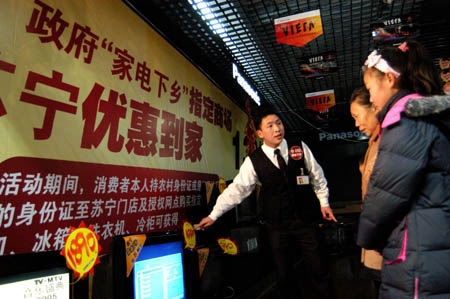 日前,貴州省暨貴陽市家電下鄉(xiāng)儀式在貴陽市烏當(dāng)區(qū)蘇寧電器家電下鄉(xiāng)銷售網(wǎng)點(diǎn)舉行,銷售人員給前來購買彩電的農(nóng)民介紹產(chǎn)品。由此,貴州省正式啟動(dòng)家電下鄉(xiāng)工作,全省共有20家企業(yè)取得銷售家電下鄉(xiāng)產(chǎn)品資格,確保每個(gè)縣的農(nóng)民就近購買到財(cái)政補(bǔ)貼類家電產(chǎn)品。