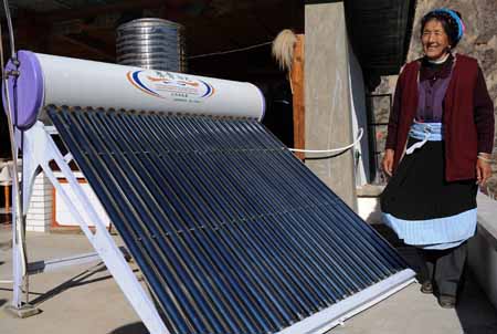 近年來(lái),平均海拔3000多米的云南省迪慶藏族自治州大力開(kāi)發(fā)太陽(yáng)能資源,發(fā)展農(nóng)村新能源建設(shè),太陽(yáng)能熱水器、太陽(yáng)能灶等設(shè)施廣泛進(jìn)入藏族群眾的家庭。隨著太陽(yáng)能的推廣,有效地改善了當(dāng)?shù)氐纳鷳B(tài)環(huán)境。圖為德欽縣奔子欄村的藏族婦女卓瑪在自家的太陽(yáng)能熱水器旁。