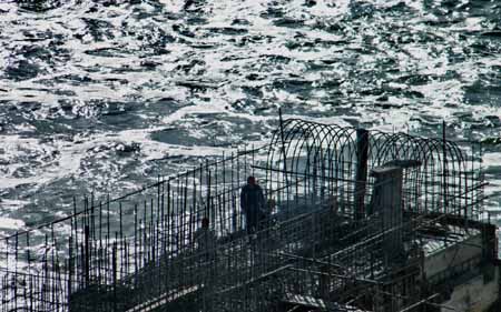 施工人員正在進(jìn)行黃河龍口水利樞紐大壩分洪口的最后施工。