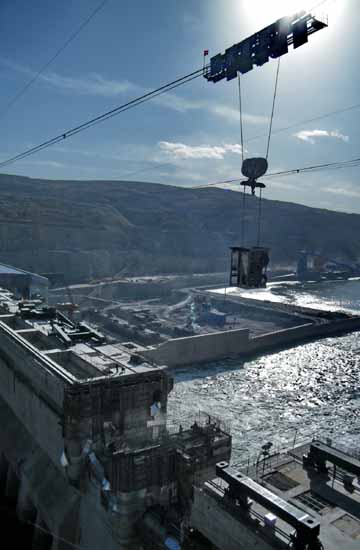 施工單位正在為黃河龍口水利樞紐大壩吊裝發(fā)電設(shè)備。