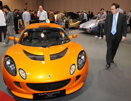 參觀者在車展上觀看一輛Exige S Sport汽車。