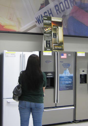 在美國(guó)得克薩斯州的Coon’S超市里,海爾美式對(duì)開(kāi)門冰箱(右側(cè))與LG冰箱同臺(tái)競(jìng)技。 |