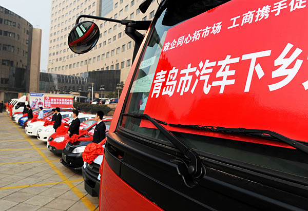 | 近日,為了擴(kuò)大內(nèi)需、拉動農(nóng)村消費(fèi),青島市啟動了“暖春行動暨家電汽車大篷車鄉(xiāng)村行”活動。86款車型入選首批“汽車下鄉(xiāng)”公示目錄,目錄包括的小型乘用車、農(nóng)用車、大型貨車等將走進(jìn)鄉(xiāng)村,廣泛征求農(nóng)民朋友意見,篩選出農(nóng)村最需要、最實(shí)用的車型產(chǎn)品。據(jù)了解,青島市“汽車下鄉(xiāng)”采取由汽車生產(chǎn)廠家讓利、政府補(bǔ)貼和農(nóng)村信用社貼息貸款三重優(yōu)惠方式,拉動農(nóng)村汽車消費(fèi)。圖為“汽車下鄉(xiāng)”公示活動中展出的部分車型。 | |