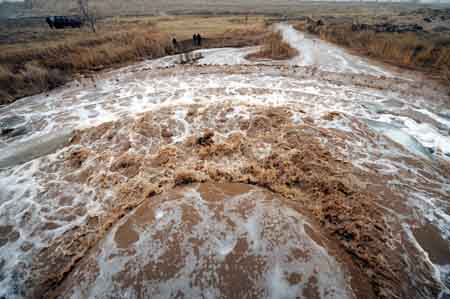 2009年甘肅景泰川電力提灌工程日前向民勤縣調(diào)水成功,黃河水流入民勤境內(nèi)的紅水河。據(jù)了解,從2001年以來(lái),景電工程已累計(jì)向民勤調(diào)水4億立方米,極大地緩解了民勤農(nóng)業(yè)用水,為緩解民勤資源性缺水發(fā)揮了重要作用。圖為黃河水流入石羊河支流紅水河。