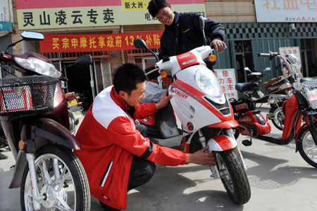 3月16日,山東萊西市夏格莊鎮(zhèn)一位青年農(nóng)民(左)在新興路一摩托車(chē)銷(xiāo)售點(diǎn)選購(gòu)享受?chē)?guó)家補(bǔ)貼的摩托車(chē)。本報(bào)記者:李紫恒