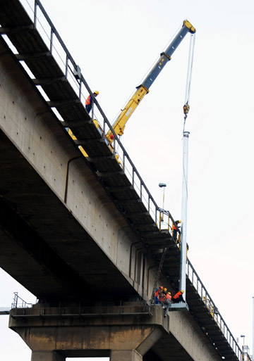 4月13日,中鐵電氣化局的施工人員在江西九江長(zhǎng)江大橋鐵路南引橋上行線吊裝橋鋼柱。當(dāng)日,京九鐵路電氣化工程九江長(zhǎng)江大橋鐵路橋改造開始全面立桿。九江長(zhǎng)江大橋鐵路橋改造是京九鐵路電氣化工程的重點(diǎn)控制性工程。于2008年8月全面啟動(dòng)的電氣化改造工程總投資76億多元。 (新華社發(fā))