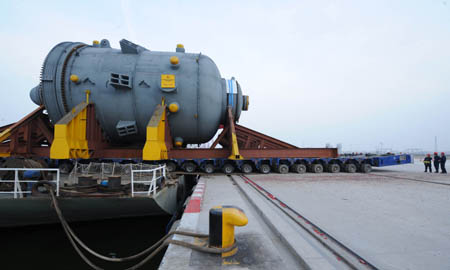 天津石化100萬噸乙烯及配套項目整臺重量最重、最昂貴的設(shè)備——EO反應(yīng)器日前在天津臨港順利完成滾裝卸船作業(yè)。據(jù)介紹,該設(shè)備本體凈重1182噸,采購價格逾2億元人民幣。圖為施工人員在進(jìn)行EO反應(yīng)器卸船作業(yè)。