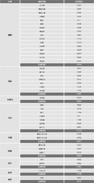 北京市各區(qū)域各板塊均價(jià)(單位:元/平方米)