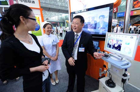 5月14日,一名參展人員(右)向觀眾介紹可通過3G網(wǎng)絡等信息技術(shù)搭建的醫(yī)療行業(yè)移動應用平臺。 當日,為期4天的2009年天津國際手機產(chǎn)業(yè)展覽會暨論壇在天津濱海新區(qū)拉開帷幕。摩托羅拉、海爾、索愛等20多家整機制造商在展覽會上發(fā)布了新品手機。國內(nèi)三大運營商推出的3G新業(yè)務成為展覽會上最大亮點。