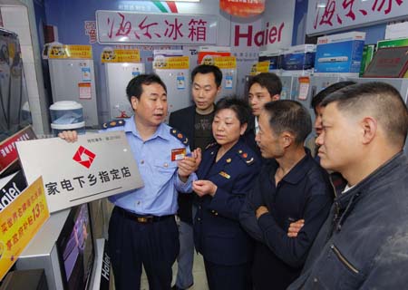 日前,重慶市梁平縣禮讓鎮(zhèn)工商所的工商干部們來到當(dāng)?shù)丶译娤锣l(xiāng)指定銷售經(jīng)營戶對其例行進(jìn)行工商巡查。為讓重慶市梁平縣受災(zāi)地區(qū)的農(nóng)村居民能夠買上正規(guī)合格的家電下鄉(xiāng)產(chǎn)品,當(dāng)?shù)毓ど趟墓ど谈刹考哟罅藢︵l(xiāng)鎮(zhèn)、農(nóng)村家電市場的監(jiān)察力度和家電下鄉(xiāng)政策的宣傳力度。
