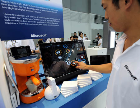 在日前舉行的臺北國際電腦展上,工作人員展示微軟公司開發(fā)的一款新產(chǎn)品,用戶可通過電話或電腦控制咖啡機,自動沖泡咖啡。