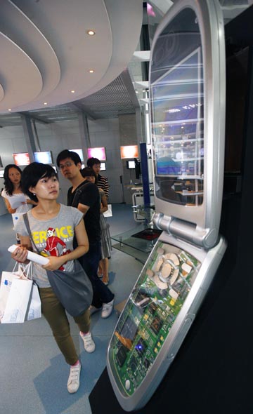 觀眾正在參觀手機(jī)的內(nèi)部芯片設(shè)計(jì)模型。