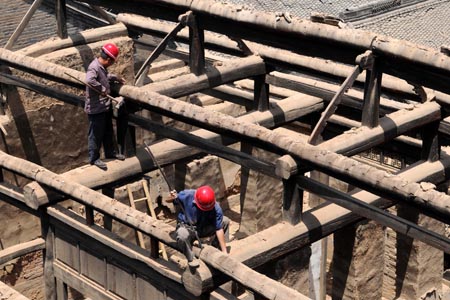 6月29日,工人們在明清古民居群異地遷建工地施工。 近日,河南省焦作市文物局開始對(duì)南水北調(diào)中線工程焦作市區(qū)段地上文物西王褚村明清民居建筑群進(jìn)行整體異地遷建。西王褚村明清民居建筑群是研究焦作地區(qū)明清民居的建筑手法及明末清初焦作工商業(yè)發(fā)展的實(shí)物依據(jù)。