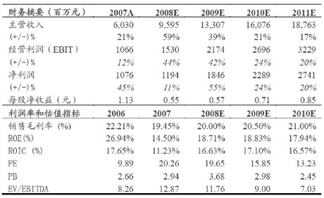 申銀萬國下調了中海油服日費率和使用率水平,將2009、2010年的業(yè)績預測由原先的0.86、1.10元下調為0.74、0.89元。2009年由于高位并購+行業(yè)景氣下滑,公司面臨一定壓力,不過目前油價已升至70美元/桶水平,盡管油價上漲對公司2009年業(yè)績影響不大,但申銀萬國認為如果下半年油價能維持在60-65美元/桶水平,公司10年的不確定性將會大大減少,11年三艘半潛式鉆井船投入以及深水項目的啟動將會給公司帶來較大增量。公司是適合長期持有的品種,基于對長期油價以及國內油田服務行業(yè)看好,依然維持增持投資評級。 |