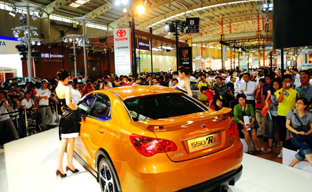 7月7日,模特在展示一款新車。當(dāng)日,第八屆中國(guó)沈陽(yáng)國(guó)際汽車工業(yè)博覽會(huì)在遼寧沈陽(yáng)國(guó)際會(huì)展中心舉行。本屆車展共吸引了200余家國(guó)內(nèi)外整車廠商和零部件企業(yè)參展,展出面積超過(guò)11萬(wàn)平方米,參展車輛近600臺(tái)。