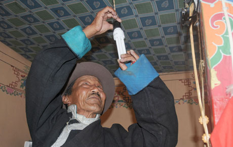 今年是西藏大面積開展節(jié)能燈推廣使用工作的第一年。有關(guān)部門計劃在年內(nèi)推廣使用60萬只節(jié)能燈,按每天使用3.5小時計算,日節(jié)電量可達10萬千瓦時,相當于彌補藏中地區(qū)1/4的用電缺口,將極大緩解西藏地區(qū)電力供應緊張的局面。圖為拉薩市納金鄉(xiāng)居民達嘎在自己家里換裝節(jié)能燈。本報記者涂洪長