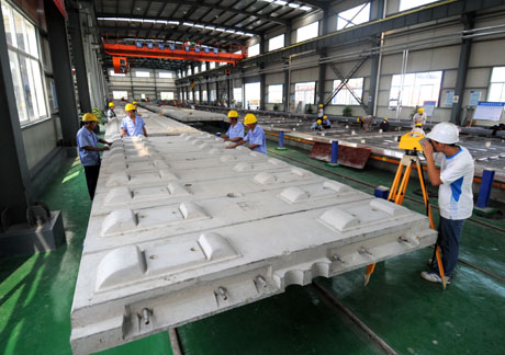 8月25日,中鐵十局嘉興軌道板場的技術(shù)人員正在查驗(yàn)下線完工的首批軌道板。 當(dāng)日,滬杭高鐵首批80多塊軌道板在中鐵十局嘉興軌道板場的第一條生產(chǎn)線上下線完工,為滬杭鐵路的按期開通奠定了基礎(chǔ)。該板是目前世界生產(chǎn)工藝最先進(jìn)的鐵路軌道板,能保證高速列車以300多公里的時速平穩(wěn)運(yùn)行。