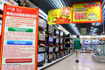 日前,天津市全面展開(kāi)家電以舊換新工作。據(jù)天津市商務(wù)委有關(guān)負(fù)責(zé)人介紹,家電銷售企業(yè)和回收企業(yè)已經(jīng)通過(guò)招標(biāo)方式確定向社會(huì)公布,消費(fèi)者可在交售舊家電購(gòu)買新家電時(shí)享受家電補(bǔ)貼。此次列入家電以舊換新補(bǔ)貼產(chǎn)品范圍的品種有電視機(jī)、電冰箱,洗衣機(jī)、空調(diào)、電腦。圖為天津一家電賣場(chǎng)在顯著位置擺放家電以舊換新宣傳展板。