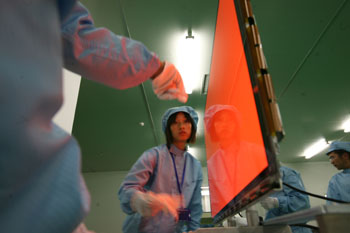 長(zhǎng)虹新型等離子顯示屏后端工序?qū)W⒌膯T工。(資料照片) |