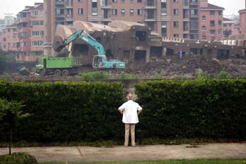 一位上海市民站在倒塌的“蓮花河畔景苑”樓盤前。新華社發(fā) |