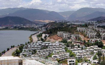 這是“洱海天域”度假產(chǎn)權(quán)式酒店項(xiàng)目俯瞰,在建的酒店和別墅群距離洱海最近距離僅有10多米,別墅群中心位置就是以前“情人湖”的所在地。新華社記者 藺以光