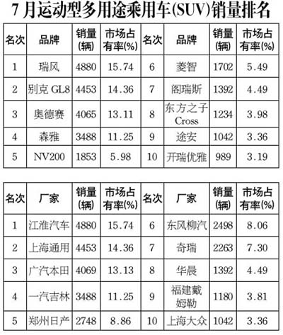 7月多功能乘用車(MPV)銷售3.10萬(wàn)輛,環(huán)比下降10.10%,同比增長(zhǎng)76.37%;其中2.0L、2.4L和1.8L排量車型銷量占比較大,銷量占比分別為24.01%、14.57%和14.19%。 與上月相比,除了東方之子Cross、開(kāi)瑞優(yōu)雅排名不變外,瑞風(fēng)與別克GL8、奧德賽與森雅名次互換,菱智與途安闖入十強(qiáng),普利馬與風(fēng)行退出十強(qiáng),NV200與閣瑞斯名次均上升兩位,分別由第七、第九上升至第五、第七。 7月瑞風(fēng)表現(xiàn)最突出,較上月大增29.54%,超過(guò)GL8取得第一,GL8較上月下降13.82%,屈居第二;奧德賽較上月增長(zhǎng)14.24%,取得第三,森雅表現(xiàn)不佳,較上月下降22.97%,退為第四;新品NV200較上月增長(zhǎng)6.86%,閣瑞斯名次上升銷量下降,較上月下降15.28%;而處于高銷量后回落期的普利馬在上月環(huán)降27.22%后,7月無(wú)緣前10。 與上月相比,銷量排名前10位的MPV企業(yè),除了奇瑞排名第七不變外,其它均有變化。前六位中,江淮汽車與上海通用,廣汽本田與一汽吉林,鄭州日產(chǎn)與東風(fēng)柳汽名次互換,上海大眾憑借途安的表現(xiàn)闖入前十,海馬汽車退出十強(qiáng),華晨與福建戴姆勒名次均上升一位,分別由第九、第十上升至第八、第九。 |