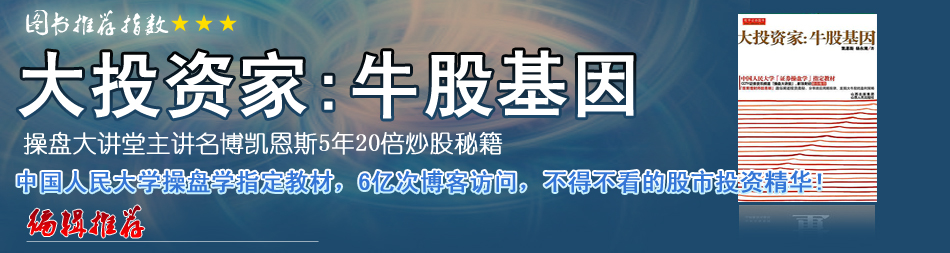 | 中國人民大學(xué)操盤學(xué)客座講師,清華大學(xué)操盤學(xué)特訓(xùn)講師,CCTV證券資訊網(wǎng)特聘專家,央視操盤大講堂特聘教授,在新浪等網(wǎng)站發(fā)表的博客,累計(jì)獲得了超過6億次的訪問。凱恩斯老師10年間先后8次成功抄底,以準(zhǔn)確把握大盤趨勢(shì)和板塊個(gè)股機(jī)會(huì)著稱。凱恩斯2008年被《英才》雜志評(píng)為“中國十大博客”,2009年被新浪網(wǎng)評(píng)為“中國十大博客”。 |