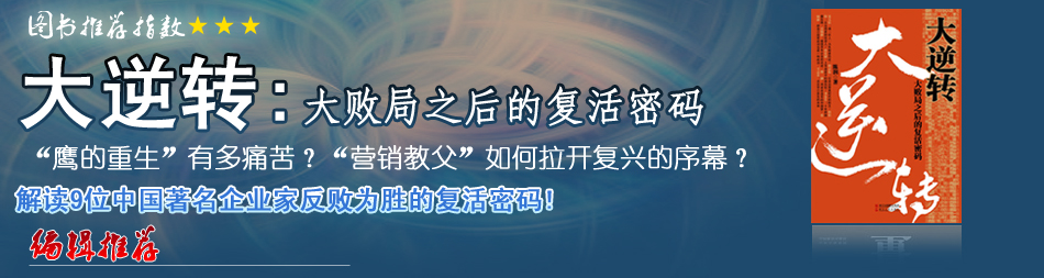 | 對(duì)于企業(yè)家而言,失敗只是華彩篇章中一個(gè)微不足道的逗號(hào)而已。財(cái)經(jīng)作家陳潤在他的新書《大逆轉(zhuǎn)》中,就寫了這樣一群不甘心失敗、再戰(zhàn)商業(yè)江湖,又重新獲得人生輝煌的企業(yè)家群體。從書中對(duì)這些案例的分析總結(jié),我們可以看見那些歷經(jīng)慘敗卻又從地上爬起來的企業(yè)家們所普遍具有的特質(zhì),那就是:狂野的夢(mèng)想、粗壯的神經(jīng)、冷靜的反思以及縝密的計(jì)劃…[詳細(xì)] |