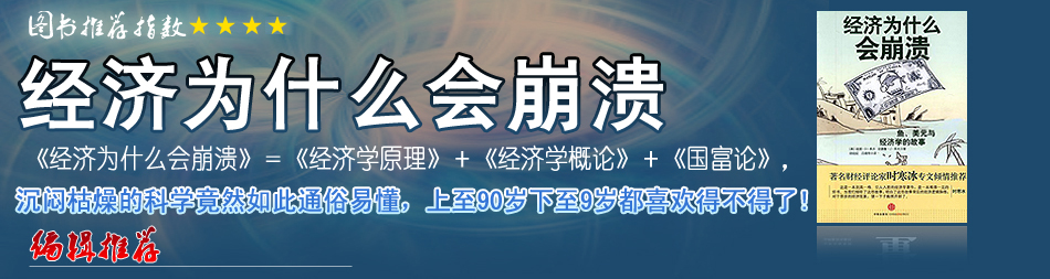 自高中時代以來,我就對經(jīng)濟學(xué)十分感興趣。于是,滿懷期待地來到大學(xué),希望對貨幣和經(jīng)濟政策有所了解?墒俏业奶彀!我簡直不知道他們在學(xué)校里都教了我們什么,那些莫名其妙的術(shù)語讓人覺得極端無聊,某位古怪糊涂的教授滿嘴專業(yè)詞匯喃喃自語,除了這些,我回憶不起來任何有價值的東西……當(dāng)我看到《經(jīng)濟為什么會崩潰》一書時,非常興奮。迄今為止,還沒有哪本經(jīng)濟學(xué)入門讀物能超越這本書。所有人都能在兩小時內(nèi)讀完它,都能明白當(dāng)今世界的貨幣政策和政府財政政策中的謬論,都清楚這些謬論正把我們引上毀滅之路。 |