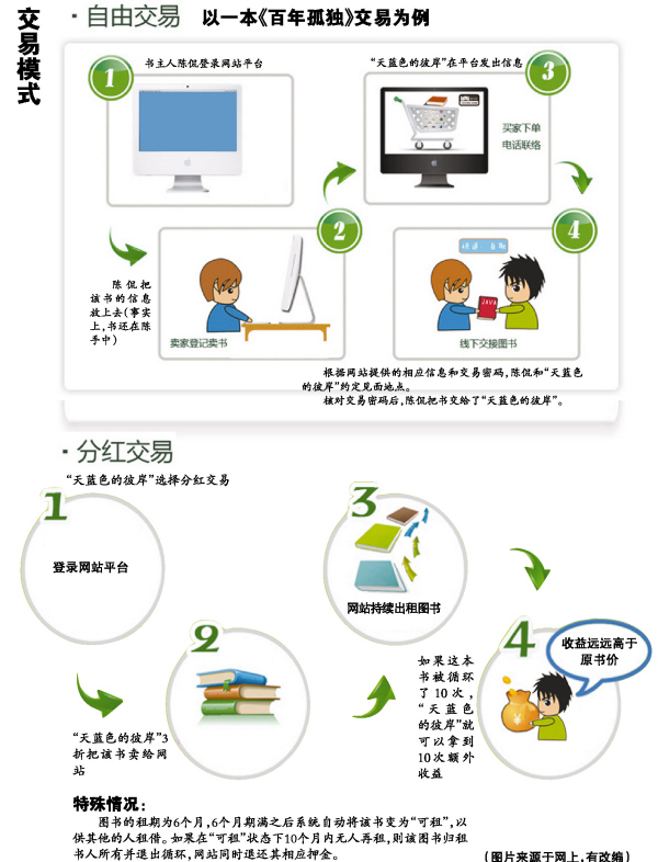 為嘗鮮,陳侃把一本《百年孤獨(dú)》放到該網(wǎng)站平臺上自由交易,說是“賣”給了圖書館,其實(shí)這本書還存放在陳侃的書柜上,只不過名義上歸了圖書館,并被登記到了“賣出信息”一欄,想租這本書的顧客可通過網(wǎng)站賣書。