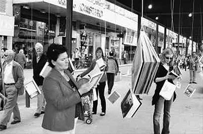 圖為西班牙馬德里街頭的一個圖書展示長廊。人們可隨意翻閱掛在長廊里的圖書。