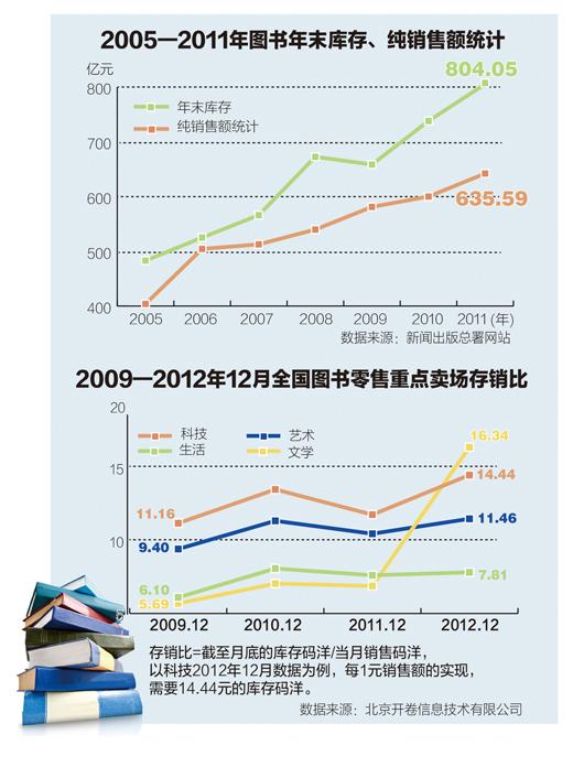 繁榮的景象之下,卻是日漸沉重的庫存負荷。全國新華書店系統(tǒng)、出版社自辦發(fā)行單位純銷售額從2005年的403.95億元增長到了2011年的653.59億元,而年末庫存則從482.92億元飛漲到804.05億元。6年時間,兩者的剪刀差從近79億元增長至150億元——庫存跑贏了銷售,更多圖書只能在倉庫中蒙塵。