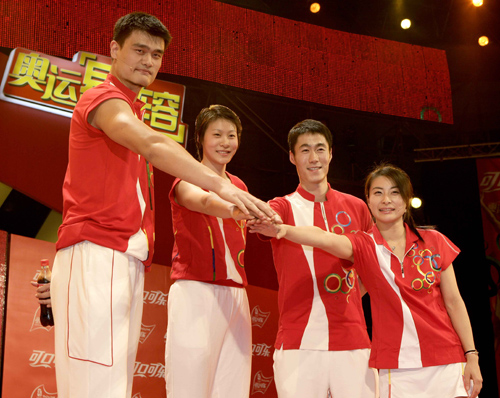 北京奧運會火炬接力全球合作伙伴可口可樂公司日前在北京宣布:2008北京奧運會火炬手提名活動在全國正式啟動。圖為中國籃球運動員姚明、排球運動員趙蕊蕊、乒乓球運動員王勵勤和跳水運動員郭晶晶(從左至右)在北京舉行的“奧運星陣容”揭幕儀式上。