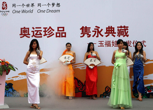 經(jīng)北京奧組委授權發(fā)行的“中國玉福娃”日前在北京王府井工美大廈舉行首發(fā)儀式!爸袊窀M蕖敝黧w部分由5個玉福娃和一個玉如意構成,以新疆和田玉為材料,每套售價29萬元,全球限量發(fā)行2008套。圖為模特在首發(fā)儀式上展示“中國玉福娃”。
