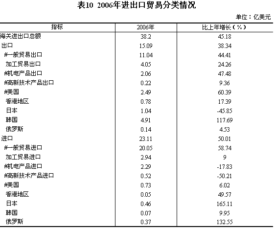 對外貿(mào)易快速增長。全年全省外貿(mào)進(jìn)出口總值為38.20億美元,比上年增長45.18%,其中:出口總值為15.09億美元,增長38.34%;進(jìn)口總值為23.11億美元,增長50.01%。一般貿(mào)易出口11.04億美元,增長44.41%;加工貿(mào)易出口4.05億美元,增長24.26%。機(jī)電產(chǎn)品出口2.06億美元,增長47.48%。高新技術(shù)產(chǎn)品出口0.22億美元,增長9.36%。