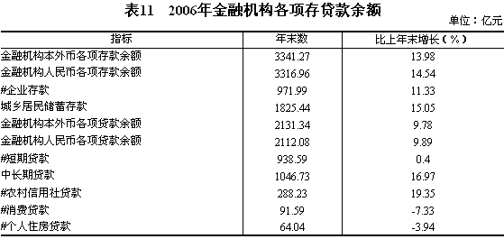 金融機(jī)構(gòu)存貸款規(guī)模繼續(xù)擴(kuò)大。年末,全省金融機(jī)構(gòu)本外幣各項(xiàng)存款余額3341.27億元,比上年末增長13.98%。全省金融機(jī)構(gòu)人民幣各項(xiàng)存款余額3316.96億元,增長14.54%,其中:企業(yè)存款余額971.99億元,增長11.33%;城鄉(xiāng)居民儲蓄存款余額1825.44億元,增長15.05%。年末全省金融機(jī)構(gòu)本外幣各項(xiàng)貸款余額2131.34億元,比上年末增長9.78%。全省金融機(jī)構(gòu)人民幣各項(xiàng)貸款余額2112.08億元,增長9.89%。