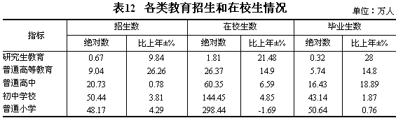 科技事業(yè)進(jìn)一步發(fā)展。認(rèn)定國家級企業(yè)(集團(tuán))技術(shù)中心5家,比上年增加3家。全年共取得省部級以上科技成果704項(xiàng),比上年增加70項(xiàng),其中:應(yīng)用技術(shù)成果651項(xiàng),軟科學(xué)成果53項(xiàng)。全年獲得獎勵177項(xiàng)。受理專利申請1460件,授權(quán)專利832件。技術(shù)交易穩(wěn)步發(fā)展,全年共簽訂技術(shù)合同1995項(xiàng),比上年增長6.29%;技術(shù)合同成交金額21.45億元,增長24.20%。 教育事業(yè)穩(wěn)步推進(jìn)。全省普通高等教育招生9.04萬人,比上年增長26.26%,在校學(xué)生26.37萬人,增長14.90%;研究生教育招生0.67萬人,增長9.84%,在學(xué)研究生1.81萬人,增長21.48%;普通高中招生20.73萬人,增長0.78%;初中學(xué)校招生50.44萬人,增長3.81%;普通小學(xué)招生48.17萬人,增長4.29%;特殊教育招生0.13萬人,在校學(xué)生0.91萬人。
