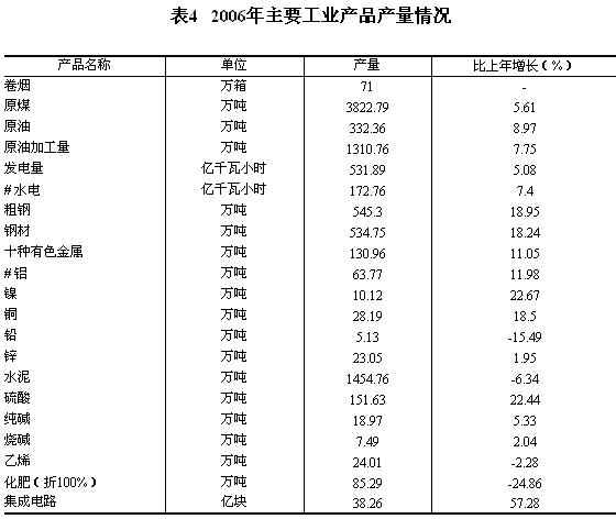 規(guī)模以上工業(yè)中,集體企業(yè)完成32.21億元,增長17.34%;外商及港澳臺企業(yè)完成21.65億元,增長18.21%;股份制企業(yè)完成432.87億元,增長16.72%。輕工業(yè)完成增加值114.59億元,增長9.54%;重工業(yè)完成增加值659.62億元,增長18.92%。 主要產(chǎn)品產(chǎn)量平穩(wěn)增長。全年發(fā)電量531.89億千瓦小時(shí),比上年增長5.08%;原煤3822.79萬噸,增長5.61%;原油332.36萬噸,增長8.97%;原油加工量1310.76萬噸,增長7.75%。粗鋼產(chǎn)量545.30萬噸,增長18.95%;鋼材534.75萬噸,增長18.24%;水泥1454.76萬噸,下降6.34%;十種有色金屬130.96萬噸,增長11.05%。