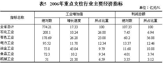 經(jīng)濟(jì)運(yùn)行質(zhì)量提高。全年規(guī)模以上工業(yè)企業(yè)盈虧相抵后,實(shí)現(xiàn)利潤總額107.35億元,比上年增長62.69%,其中國有及國有控股企業(yè)實(shí)現(xiàn)利潤85.25億元,增長61.40%。規(guī)模以上工業(yè)中,集體企業(yè)實(shí)現(xiàn)利潤4.26億元,增長84.97%;股份制企業(yè)實(shí)現(xiàn)利潤47.94億元,增長26.58%;外商及港澳臺企業(yè)實(shí)現(xiàn)利潤2.33億元,增長51.03倍。規(guī)模以上工業(yè)虧損企業(yè)虧損額73.19億元,比上年增長43.43%,其中國有及國有控股虧損企業(yè)虧損額69.62億元,增長50.12%。 支柱行業(yè)增勢強(qiáng)勁,支撐作用不斷加大。石化、有色、電力、冶金、食品和機(jī)械等支柱產(chǎn)業(yè)完成工業(yè)增加值占規(guī)模以上工業(yè)的88.01%,其中:石化工業(yè)完成增加值208.10億元,比上年增長10.24%;有色工業(yè)完成增加值178.69億元,增長26.28%;電力工業(yè)完成增加值95.52億元,增長11.78%;冶金工業(yè)完成增加值75.80億元,增長45.04%。
