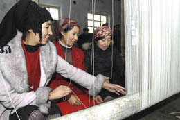 幫助群眾就業(yè)。1月3日,在新疆庫(kù)車縣庫(kù)木艾克社區(qū)居委會(huì),老師左然木(左一)在教農(nóng)民織地毯。新華社記者:季春鵬 攝 |