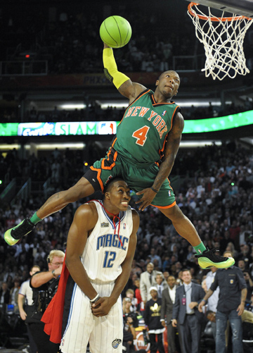 | 羅賓遜(上)與霍華德 | 今年NBA全明星賽的最有價值球員(MVP)獎杯頒給了“OK”組合——“大鯊魚”奧尼爾和科比·布萊恩特這對昔日洛杉磯湖人隊的歡喜冤家。 在這場西部明星隊以146:119大勝東部明星隊的比賽中,科比得到了全場最高的27分,奧尼爾只砍下了17分,但這位15次入選全明星賽(全聯(lián)盟排名第二)的大塊頭,仗著比賽是在自己母隊的主場進行,儼然成為場上最為搶鏡的主角。奔著“四張”去的奧胖還是那副“搞笑大師”的做派,以夸張、詼諧的表演成為全場最能愉悅觀眾的球員。結(jié)果,經(jīng)球迷和媒體投票,奧尼爾和科比一起當選MVP。 劉德華前幾年拍了一部《大塊頭有大智慧》的電影,而奧尼爾幾乎在每次全明星賽上都告訴你什么是大塊頭有大幽默。比如2007年拉著“小皇帝”詹姆斯一起跳的那段相當專業(yè)的大屁股街舞,再比如他總是能把那雙球鞋弄出花樣(改裝成遙控車或是老虎機)。沒有奧胖的全明星賽是不可想象的,去年新奧爾良缺了這個“開心果”,很多人都感到不爽。 與“鯊魚”一同閃耀NBA全明星周末的是小飛人內(nèi)特·羅賓遜(紐約尼克斯隊)。后者憑借1.75米的身高,在扣籃大賽中擊敗了海拔2.11米、披著“超人”斗篷的德懷特·霍華德,一舉成為“扣籃王”。這是小飛人繼2006年之后又一次拿到該獎項,此前只有“飛人”喬丹等四人先后獲得過兩屆“扣籃王”稱號。 當然,羅賓遜要好好感謝一下甘為陪襯的霍華德。前者在決賽中一身綠裝,有意讓人聯(lián)想起漫畫中專門抑制“超人”能力的元素“氪”,還事先安排披著“超人”斗篷的霍華德作為人梯。后者沒有考慮輸贏,而是將全明星周末的娛樂性發(fā)揮到極限,不假思索地就答應(yīng)下來,于是兩人上演了一幕“小個子飛躍超人”的好戲。雖然今年的全明星“票王”霍華德沒能舉起扣籃大賽的獎杯,但其天生的搞笑細胞和娛樂大眾的良好意識,已經(jīng)得到了NBA內(nèi)外的一致認可。有媒體評論說,謝天謝地,“大鯊魚”奧尼爾在全明星周末的耍寶角色終于后繼有人了。 和羅賓遜一起“飛”起來的,是俄羅斯女子撐桿跳高奧運冠軍伊辛巴耶娃。2月15日,她在烏克蘭舉行的一項年度大賽中將橫桿的位置提升到5米的高度。伊娃在第二跳時躍過了這一高度,奉獻了一項新的世界紀錄。 飛得高的是飛人,跑得快的也是飛人。 牙買加飛人博爾特雖然不久前被指在酒吧大跳“臟舞”,但2月14日情人節(jié)那天的比賽結(jié)果表明:北京奧運會的男子百米冠軍并沒有荒廢武功。在牙買加首都金斯敦舉行的2009年坎伯當精英賽上,博爾特參加了男子400米比賽,以不可動搖的優(yōu)勢獲得了冠軍。博爾特的成績并不算好,只有46秒35,遠遠落后于這個項目的世界紀錄43秒18(1999年由美國人邁克爾·約翰遜創(chuàng)造),但其象征意義卻很大:這個目前世界上跑得最快的人(奧運會100米和200米雙料冠軍),終于要向男子400米發(fā)起總攻。 回頭來看,博爾特的酒吧丑聞只是一個小插曲,盡管紙醉金迷的時光很誘人,但博爾特并沒陷入其中而樂不思蜀。其經(jīng)紀人希姆斯曾披露,盡管新年前后“閃電”博爾特的社交活動比以往要多,但他并沒有放松冬訓,只不過放緩了一下訓練進度。希姆斯的話還可以這樣理解,博爾特是個聰明又本分的運動員,既可在放松的時候玩到忘乎所以、不顧形象,又知道什么時候返回訓練場,向著更高的目標發(fā)起挑戰(zhàn)。身為公眾人物,博爾特狂泡酒吧、濫秀舞技,估計當不上道德楷模,但至少守住了一個靠身體吃飯、憑成績拿獎金的職業(yè)運動員的底線,這可比國內(nèi)一些足球運動員場下胡鬧場上腿軟強得多。博爾特的教練邁爾斯也替弟子高興,他希望博爾特能在2010年實現(xiàn)“大滿貫”,把男子100米、200米和400米三項世界紀錄攬入懷中。 替弟子高興的還有孫海平。中國的“翔飛人”在美國接受手術(shù)后,其傷口恢復得相當好,雖然再次騰飛還提不上日程,但距離人們的希望又近了一些。按計劃,劉翔將在本月底或是下月初回國,到時候,他一定要在眾目睽睽下稱重,看看到底是胖了還是瘦了。似乎是在春節(jié)前,有媒體誤傳翔飛人增重30斤,“雷”倒了國內(nèi)一干“粉絲”。有人就此揶揄說,如果“翔飛人”胖得沒了樣,那一定是在養(yǎng)病期間不小心多喝了幾箱其代言的某種碳酸飲品,就是顏色黑黑的、味道有點兒苦的那種。