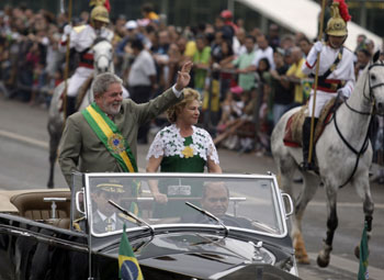 9月7日是巴西紀念獨立日,巴西總統(tǒng)盧拉(左)與夫人一起抵達在巴西利亞舉行的獨立日閱兵儀式現(xiàn)場時向人們揮手致意。新華社/路透 |