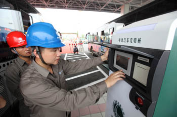8月10日,在湖北襄樊市鄧城電動汽車充電站,工作人員準備為電動大客車充電。 當日,襄樊市鄧城電動汽車充電站正式投入使用,它是湖北首座電動汽車充電站。該充電站可同時為10輛大巴、20輛中巴和30輛轎車充電。它還設(shè)有50組蓄電池的電動汽車換電區(qū),可直接更換蓄電池,減少電動汽車電能補給時間,滿足應(yīng)急充電需求及長途旅行需要!⌒氯A社發(fā)(張文華/攝)